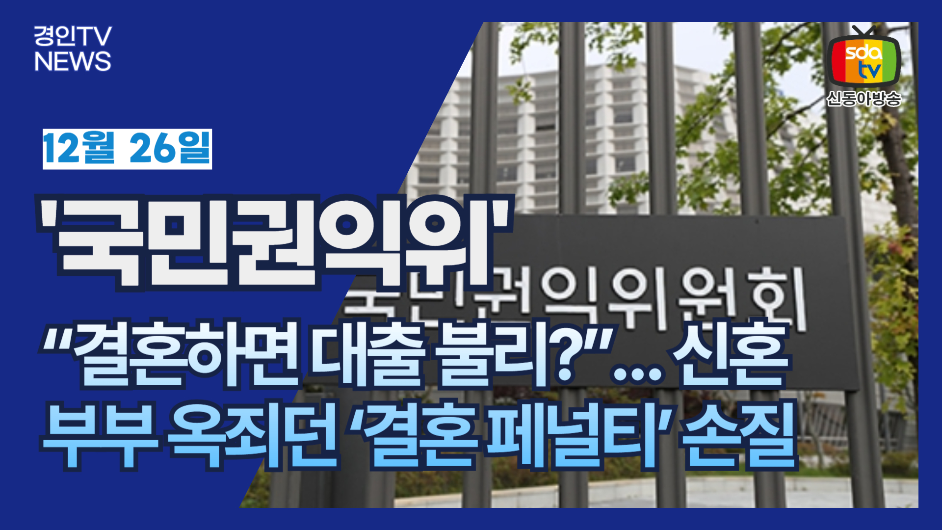 국민권익위원회가 혼인 이후 주택금융 대출에서 불리하게 작용해 온 기준을 현실에 맞게 조정하도록 국토교통부에 제도 개선을 권고했다. 이른바 ‘결혼 페널티’로 불리는 혼인신고 후 대출 제한·금리 상승 문제를 완화하자는 취지다.