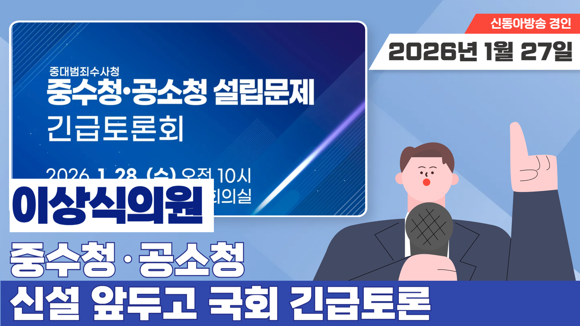 국회에서 중대범죄수사청(중수청)과 공소청 신설을 둘러싼 입법 논의가 본격적으로 진행된다. 더불어민주당 이상식 의원(경기 용인갑)은 오는 28일 오전 10시, 국회 의원회관 제8간담회의실에서 관련 법률 제정 방향을 논의하는 ‘중수청·공소청 법안 긴급토론회’를 연다고 밝혔다. 이번 행사는 위성곤·이해식·권칠승·이광희·이재관 의원이 공동으로 주최한다.